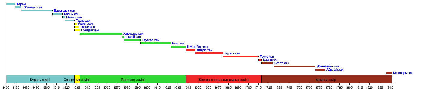 Кенесары ханАбылай ханӘбілмәмбет ханБолат ханҚайып ханТәуке ханБатыр ханСалқам Жәңгір ханЖәнібек хан ЕсімұлыЕсім ханТәуекел ханШығай ханХақназар ханБұйдаш ханТоғым ханАхмет ханТахир ханМамаш ханҚасым ханБұрындық ханӘз-Жәнібек ханКерей хан